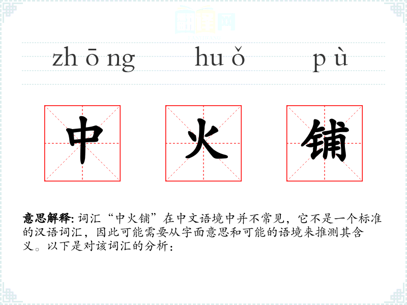 词汇“中火铺”在中文语境中并不常见,它不是一个标准的汉语词汇,因此可能需要从字面意思和可能的语境来推测其含义。以下是对该词汇的分析: