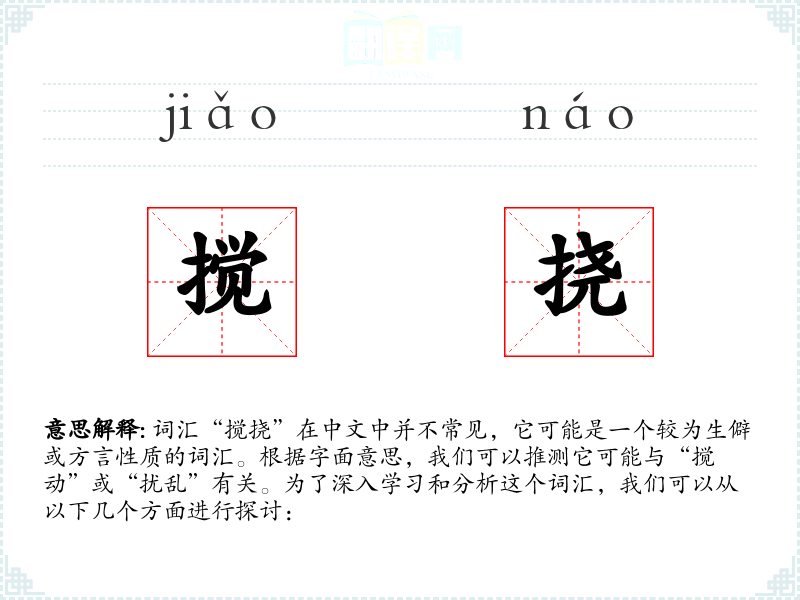 词汇“搅挠”在中文中并不常见,它可能是一个较为生僻或方言性质的词汇。根据字面意思,我们可以推测它可能与“搅动”或“扰乱”有关。为了深入学习和分析这个词汇,我们可以从以下几个方面进行探讨: