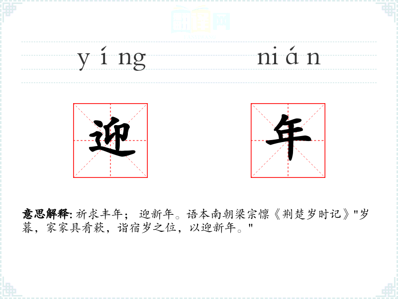 祈求丰年; 迎新年。语本南朝梁宗懔《荆楚岁时记》"岁暮,家家具肴蔌,诣宿岁之位,以迎新年。"