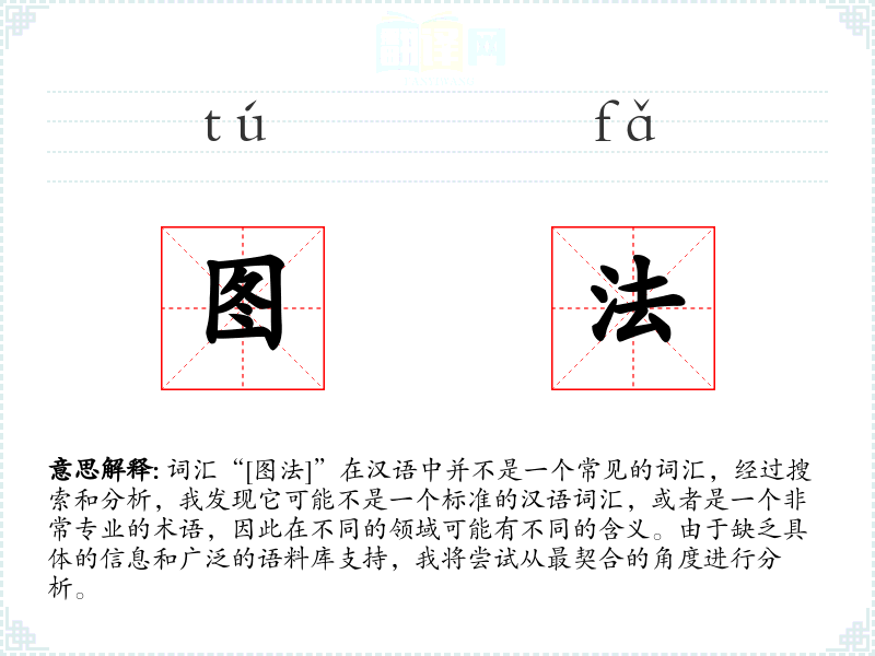 词汇“[图法]”在汉语中并不是一个常见的词汇,经过搜索和分析,我发现它可能不是一个标准的汉语词汇,或者是一个非常专业的术语,因此在不同的领域可能有不同的含义。由于缺乏具体的信息和广泛的语料库支持,我将尝试从最契合的角度进行分析。