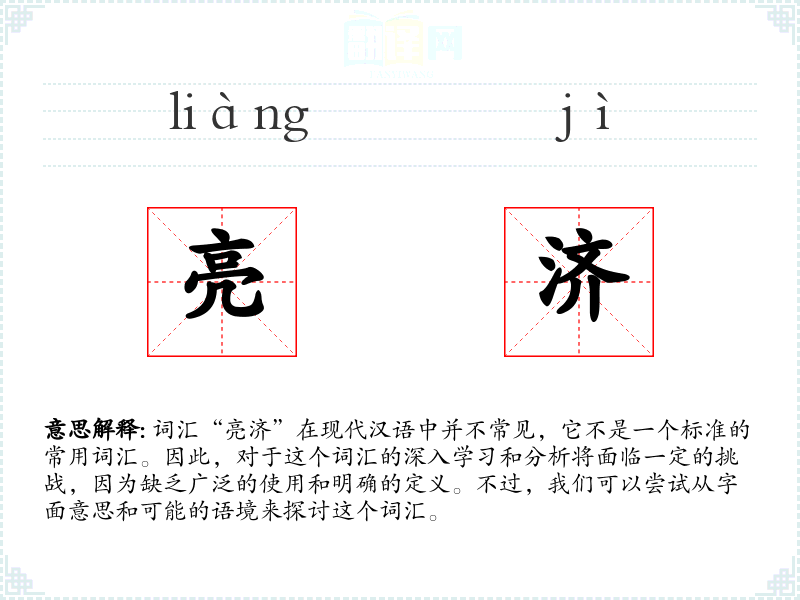 总的来说,“亮济”是一个不常见的词汇,其含义和使用都非常有限。在语言学习和表达中,它可能不是一个重要的词汇,但在创造性写作中,它可以作为一个独特的元素来使用。
