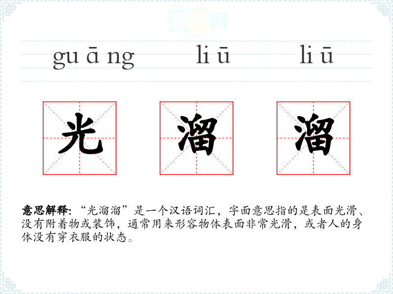 “光溜溜”是一个汉语词汇,字面意思指的是表面光滑、没有附着物或装饰,通常用来形容物体表面非常光滑,或者人的身体没有穿衣服的状态。