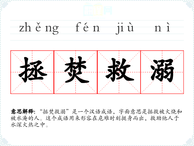 “拯焚救溺”是一个汉语成语,字面意思是拯救被火烧和被水淹的人。这个成语用来形容在危难时刻挺身而出,救助他人于水深火热之中。