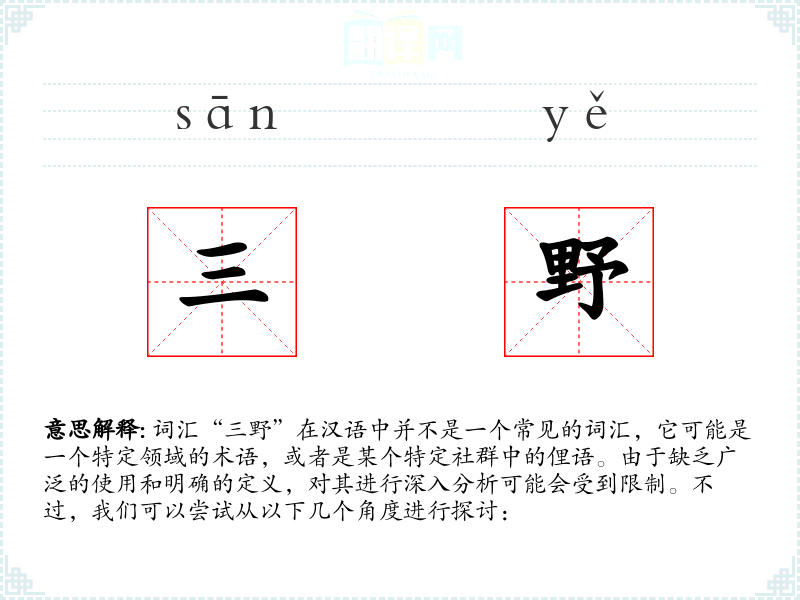 由于“三野”不是一个标准词汇,我们无法给出一个确切的字面意思和基本含义。它可能是指某个特定领域中的三个野外、野战或野生区域,或者是某个特定社群中的俚语或缩写。