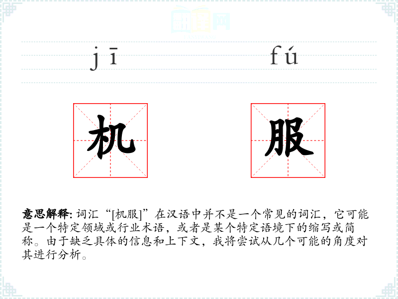 词汇“[机服]”在汉语中并不是一个常见的词汇,它可能是一个特定领域或行业术语,或者是某个特定语境下的缩写或简称。由于缺乏具体的信息和上下文,我将尝试从几个可能的角度对其进行分析。