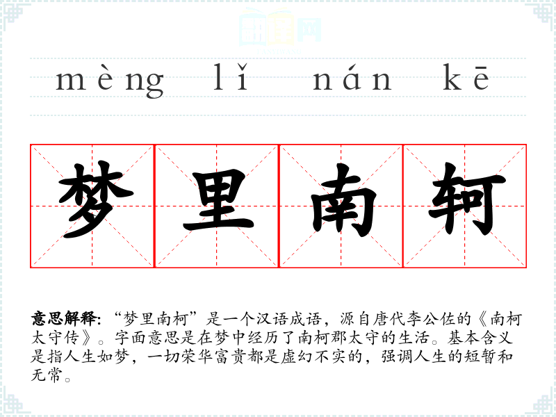 “梦里南柯”是一个汉语成语,源自唐代李公佐的《南柯太守传》。字面意思是在梦中经历了南柯郡太守的生活。基本含义是指人生如梦,一切荣华富贵都是虚幻不实的,强调人生的短暂和无常。