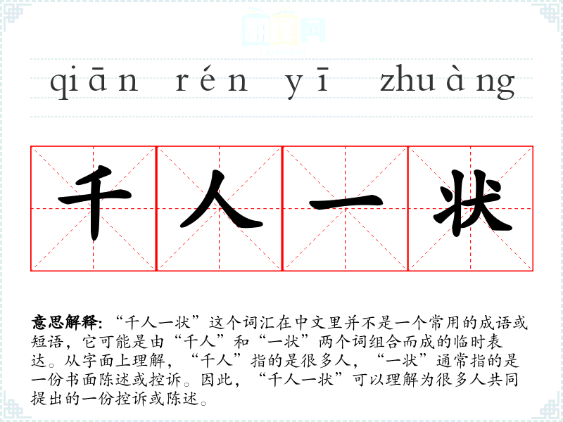 "千人一状"的意思解释、千人一状是什么意思由翻译网汉语词典查词提供。
