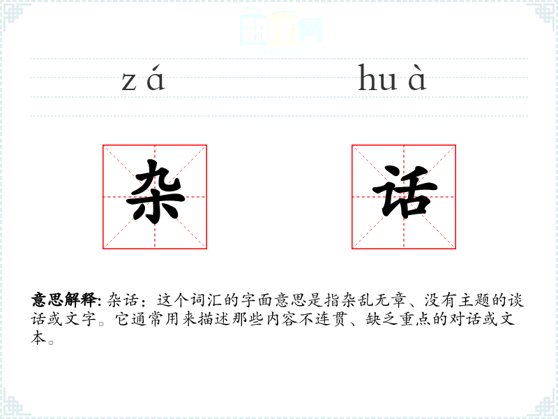 杂话:这个词汇的字面意思是指杂乱无章、没有主题的谈话或文字。它通常用来描述那些内容不连贯、缺乏重点的对话或文本。