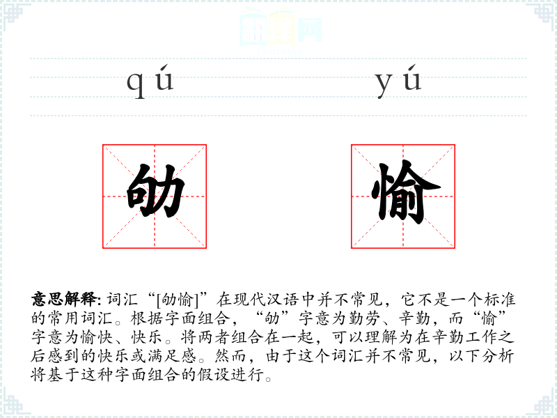 词汇“[劬愉]”在现代汉语中并不常见,它不是一个标准的常用词汇。根据字面组合,“劬”字意为勤劳、辛勤,而“愉”字意为愉快、快乐。将两者组合在一起,可以理解为在辛勤工作之后感到的快乐或满足感。然而,由于这个词汇并不常见,以下分析将基于这种字面组合的假设进行。