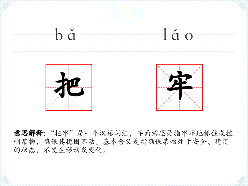 “把牢”是一个汉语词汇,字面意思是指牢牢地抓住或控制某物,确保其稳固不动。基本含义是指确保某物处于安全、稳定的状态,不发生移动或变化。