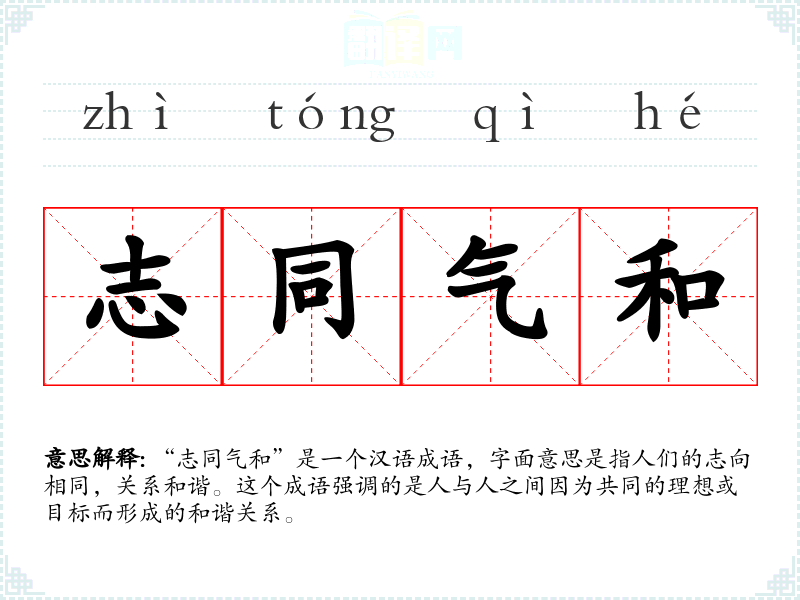 “志同气和”是一个汉语成语,字面意思是指人们的志向相同,关系和谐。这个成语强调的是人与人之间因为共同的理想或目标而形成的和谐关系。