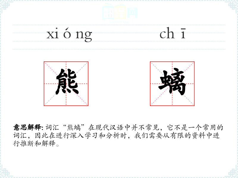 词汇“熊螭”在现代汉语中并不常见,它不是一个常用的词汇,因此在进行深入学*和分析时,我们需要从有限的资料中进行推断和解释。