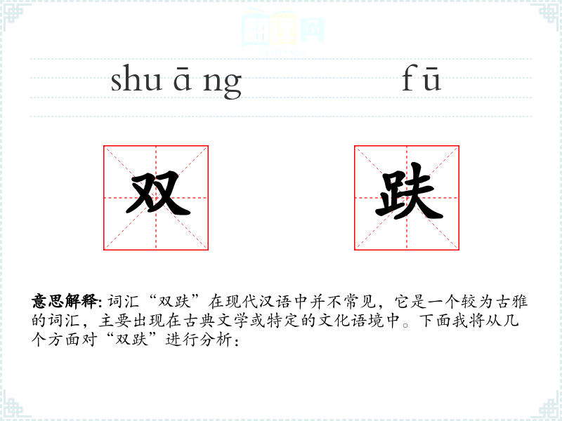 词汇“双趺”在现代汉语中并不常见,它是一个较为古雅的词汇,主要出现在古典文学或特定的文化语境中。下面我将从几个方面对“双趺”进行分析: