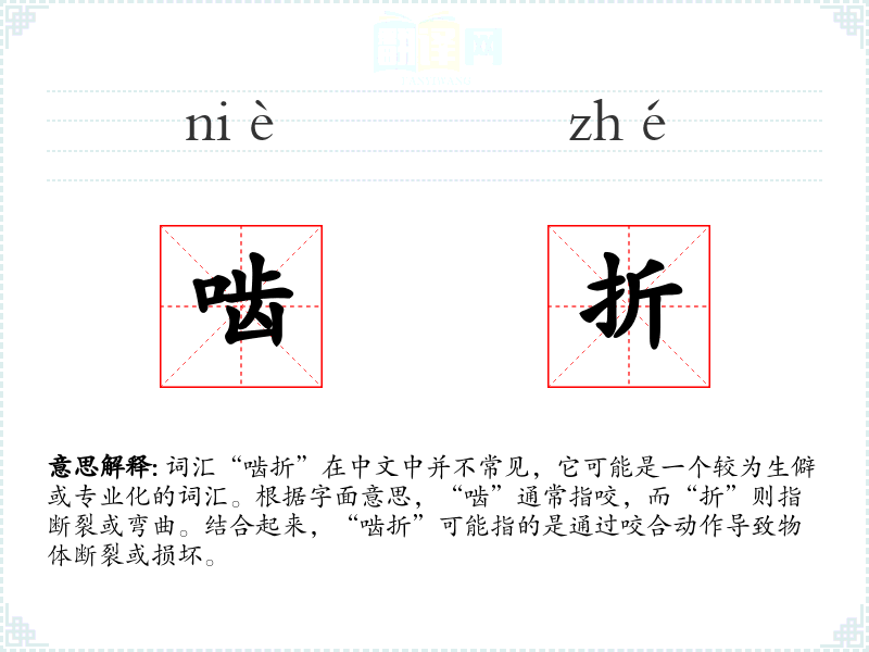 - 词源:“啮”源自古代汉语,意为咬;“折”同样源自古代汉语,意为断裂。