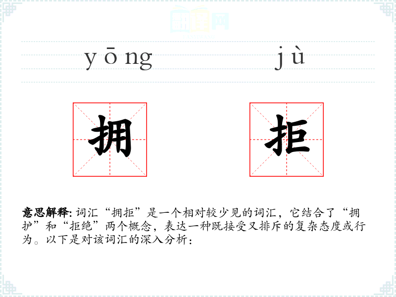 词汇“拥拒”是一个相对较少见的词汇,它结合了“拥护”和“拒绝”两个概念,表达一种既接受又排斥的复杂态度或行为。以下是对该词汇的深入分析:
