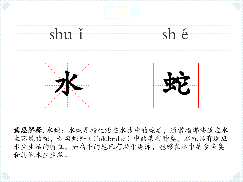 - 同义词:水蛇的同义词可能包括“水生蛇”、“游蛇”等,它们都指生活在水中的蛇类。
