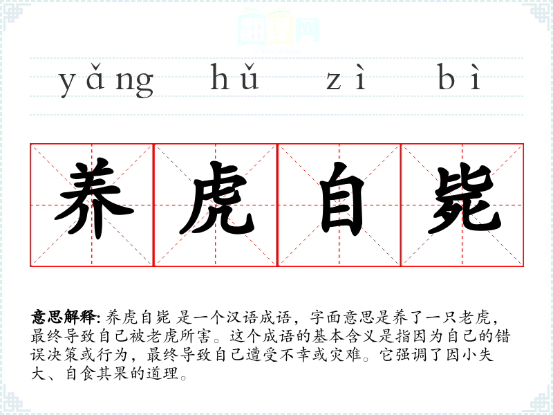 养虎自毙 是一个汉语成语,字面意思是养了一只,最终导致自己被所害。这个成语的基本含义是指因为自己的错误决策或行为,最终导致自己遭受不幸或灾难。它强调了因小失大、自食其果的道理。