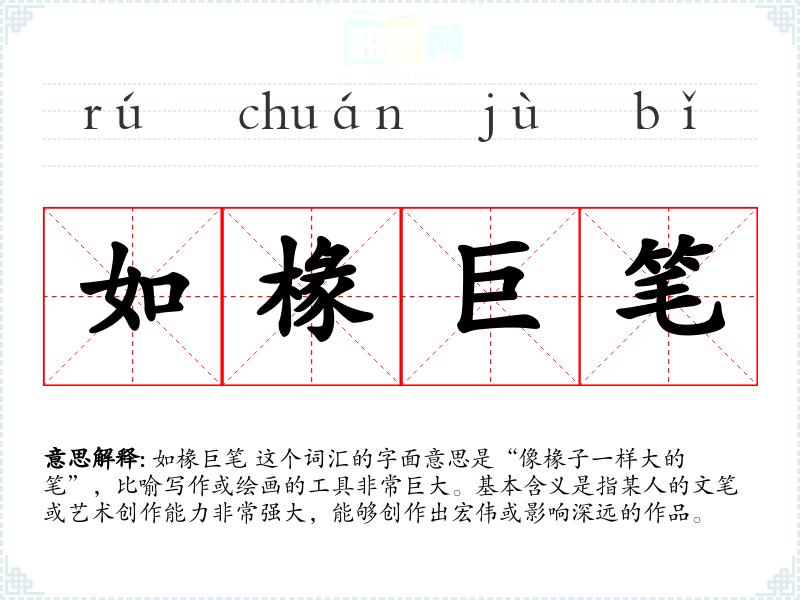如椽巨笔 这个词汇的字面意思是“像椽子一样大的笔”,比喻写作或绘画的工具非常巨大。基本含义是指某人的文笔或艺术创作能力非常强大,能够创作出宏伟或影响深远的作品。