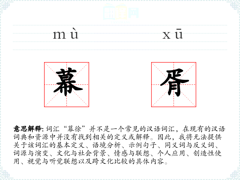 然而,如果“幕徐”是一个特定领域或方言中的词汇,或者是一个新造词,那么可能需要特定的背景知识或专业领域的资料来解析。在这种情况下,建议查阅相关的专业文献或咨询该领域的专家。