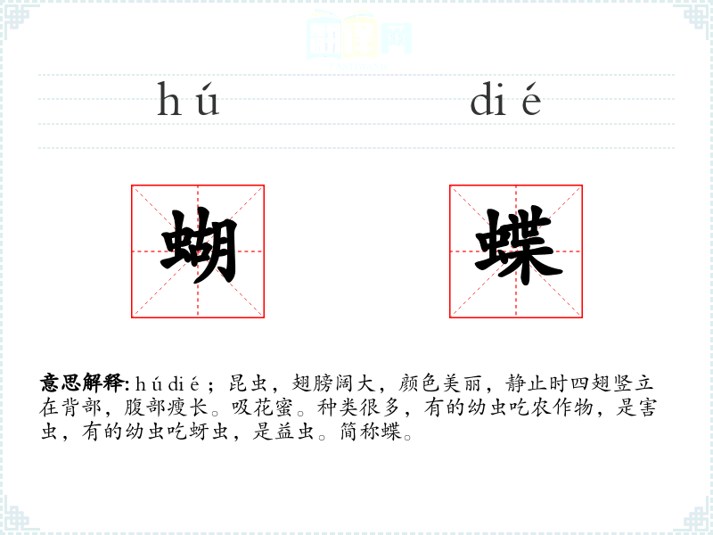 húdié;昆虫,翅膀阔大,颜色美丽,静止时四翅竖立在背部,腹部瘦长。吸花蜜。种类很多,有的幼虫吃农作物,是害虫,有的幼虫吃蚜虫,是益虫。简称蝶。