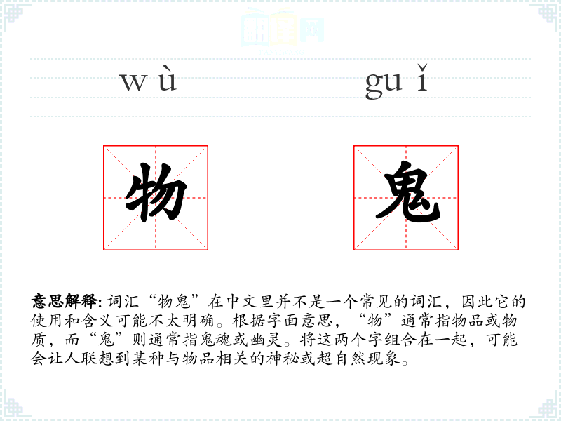 - 反义词:无(由于“物鬼”不是一个常用词汇,很难找到直接的反义词)