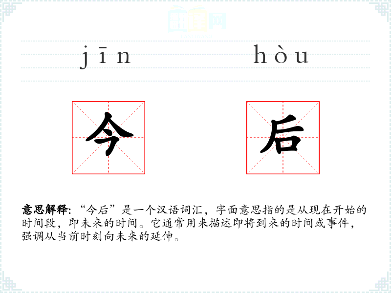 “今后”由“今”和“后”两个字组成,“今”表示现在,“后”表示之后。这个词汇在汉语中历史悠久,基本含义未有大的变化,始终用来指代从现在开始的未来时间。