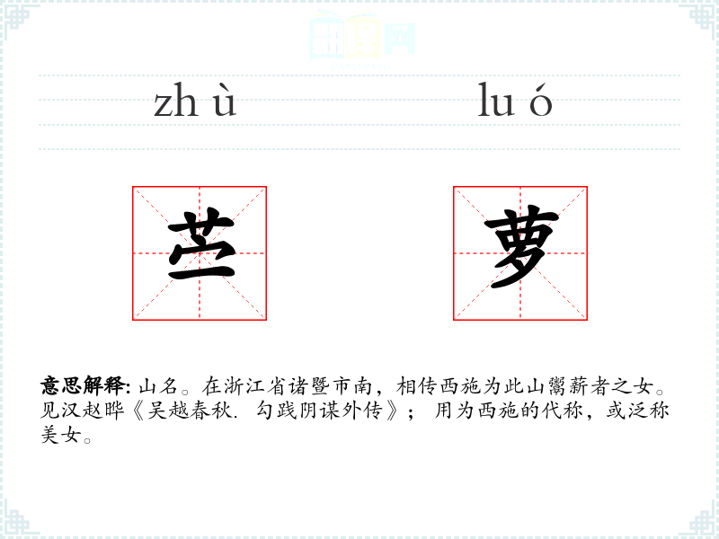 山名。在浙江省诸暨市南,相传西施为此山鬻薪者之女。见汉赵晔《吴越春秋.勾践阴谋外传》; 用为西施的代称,或泛称美女。