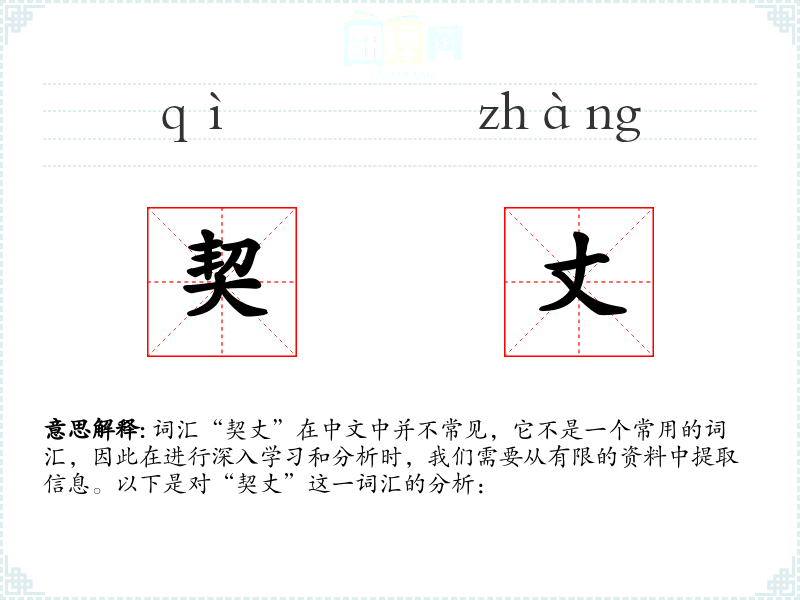 词汇“契丈”在中文中并不常见,它不是一个常用的词汇,因此在进行深入学*和分析时,我们需要从有限的资料中提取信息。以下是对“契丈”这一词汇的分析: