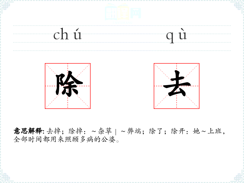 去掉;除掉:~杂草|~弊端;除了;除开:她~上班,全部时间都用来照顾多病的公婆。