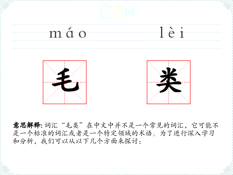 由于“毛类”不是一个常见的词汇,我们无法给出一个确切的基本定义。它可能是指与毛发相关的事物,或者是某个特定领域(如纺织、动物学)的术语。