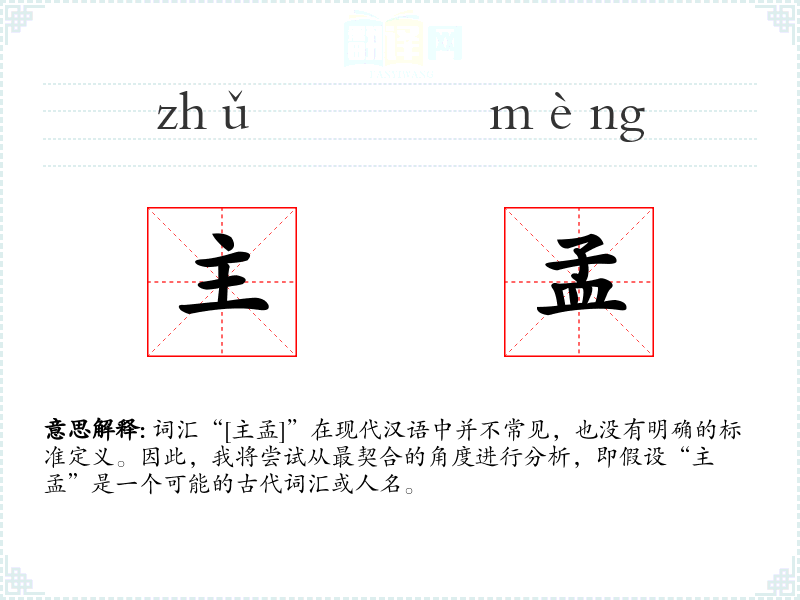 词汇“[主孟]”在现代汉语中并不常见,也没有明确的标准定义。因此,我将尝试从最契合的角度进行分析,即假设“主孟”是一个可能的古代词汇或人名。
