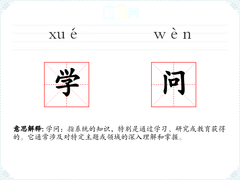 学问:指系统的知识,特别是通过学*、研究或教育获得的。它通常涉及对特定主题或领域的深入理解和掌握。