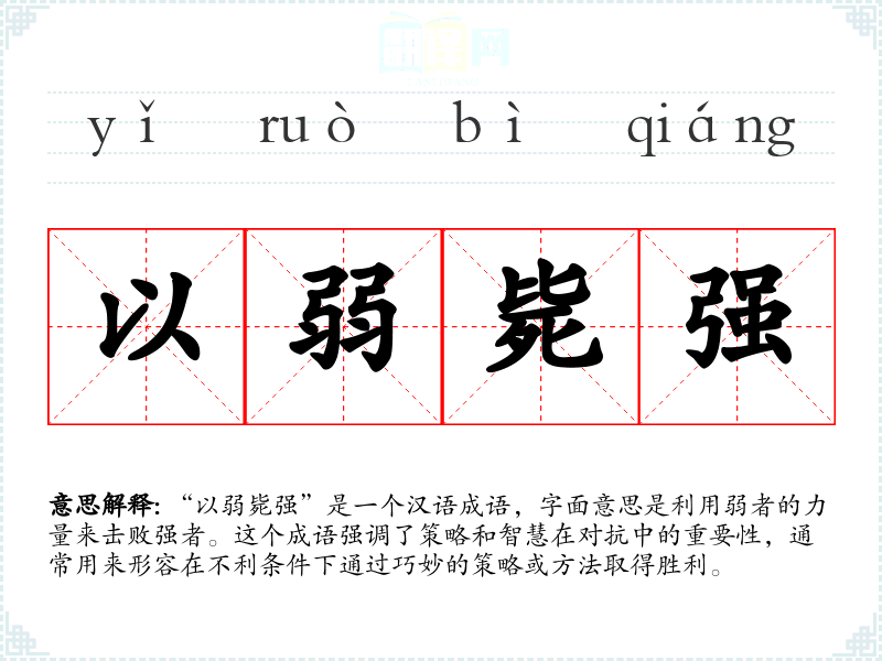 “以弱毙强”是一个汉语成语,字面意思是利用弱者的力量来击败强者。这个成语强调了策略和智慧在对抗中的重要性,通常用来形容在不利条件下通过巧妙的策略或方法取得胜利。