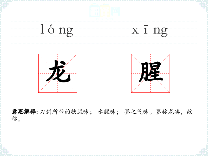 刀剑所带的铁腥味; 水腥味; 墨之气味。墨称龙宾,故称。