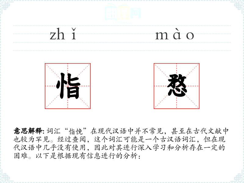 由于“恉悗”在现代汉语中不常用,其字面意思和基本含义难以确定。可能是形容词或名词,但具体含义不明。