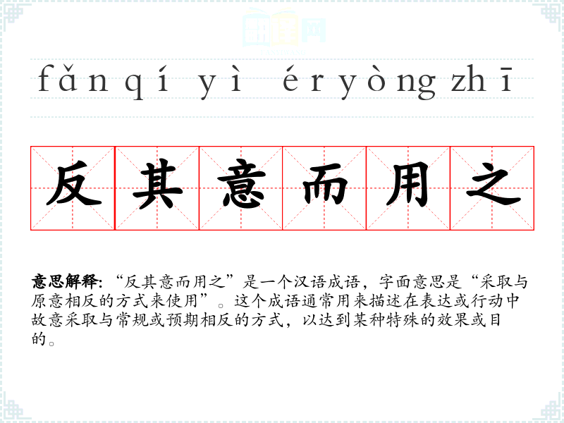 “反其意而用之”是一个汉语成语,字面意思是“采取与原意相反的方式来使用”。这个成语通常用来描述在表达或行动中故意采取与常规或预期相反的方式,以达到某种特殊的效果或目的。