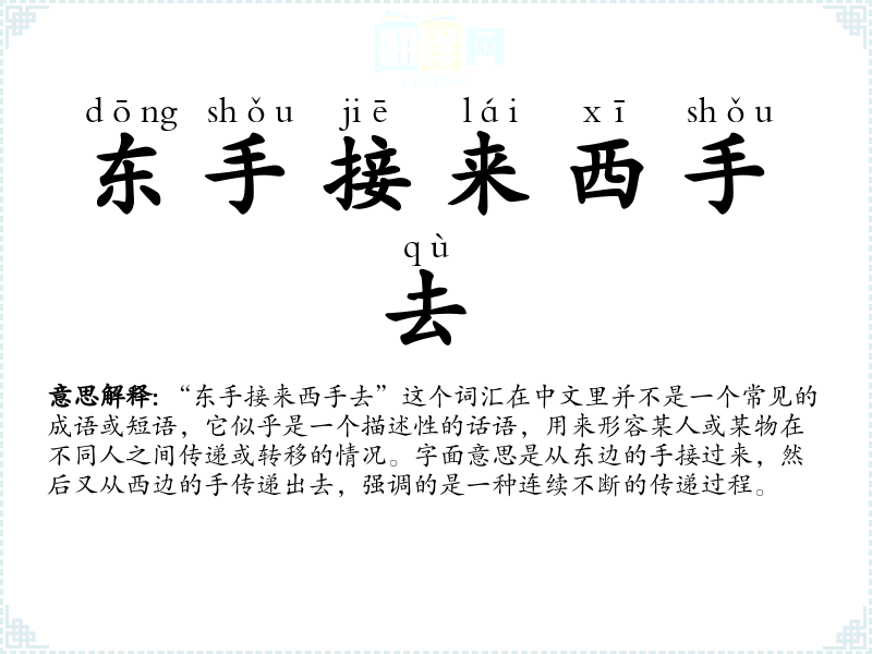 "东手接来西手去"的意思解释、东手接来西手去是什么意思由翻译网汉语词典查词提供。