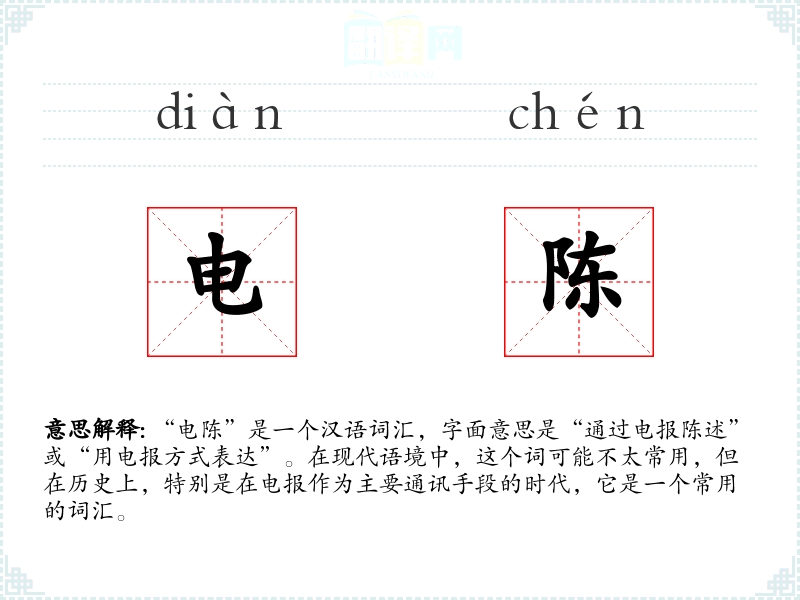 “电陈”是一个汉语词汇,字面意思是“通过电报陈述”或“用电报方式表达”。在现代语境中,这个词可能不太常用,但在历史上,特别是在电报作为主要通讯手段的时代,它是一个常用的词汇。