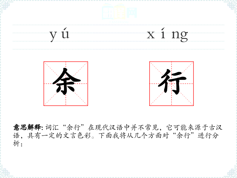 词汇“余行”在现代汉语中并不常见,它可能来源于古汉语,具有一定的文言色彩。下面我将从几个方面对“余行”进行分析: