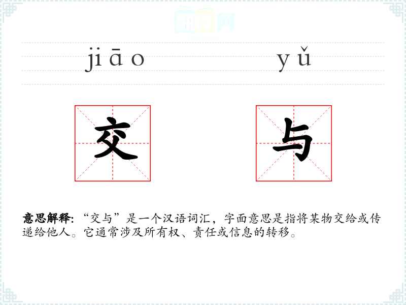 “交与”由两个字组成,“交”字古已有之,意为交接、交流,“与”字意为给予、参与。这两个字的结合,形成了表示转移的概念。在古代文献中,这个词汇就已经被广泛使用,如《左传》等历史文献中就有“交与”的用法。