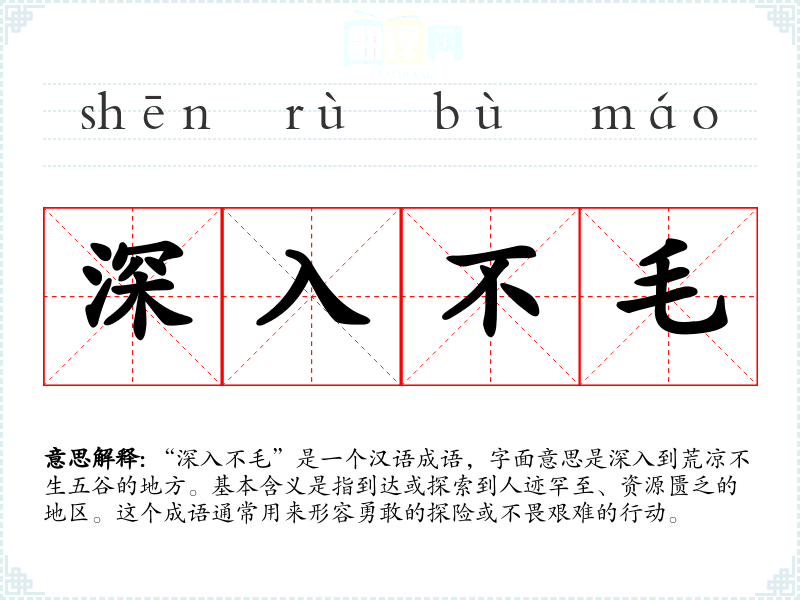 “深入不毛”是一个汉语成语,字面意思是深入到荒凉不生五谷的地方。基本含义是指到达或探索到人迹罕至、资源匮乏的地区。这个成语通常用来形容勇敢的探险或不畏艰难的行动。