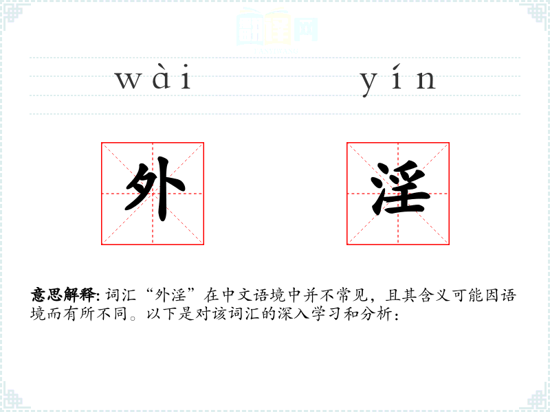 词汇“外淫”在中文语境中并不常见,且其含义可能因语境而有所不同。以下是对该词汇的深入学*和分析:
