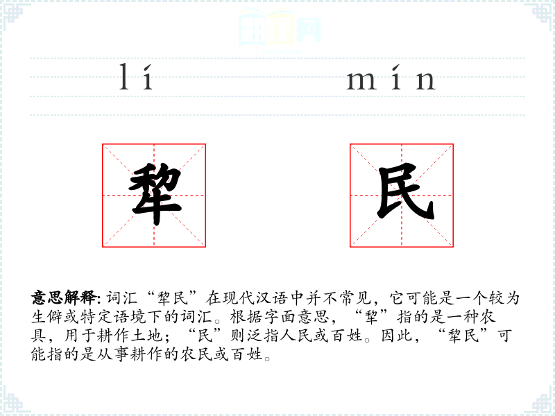 词汇“犂民”在现代汉语中并不常见,它可能是一个较为生僻或特定语境下的词汇。根据字面意思,“犂”指的是一种农具,用于耕作土地;“民”则泛指人民或百姓。因此,“犂民”可能指的是从事耕作的农民或百姓。
