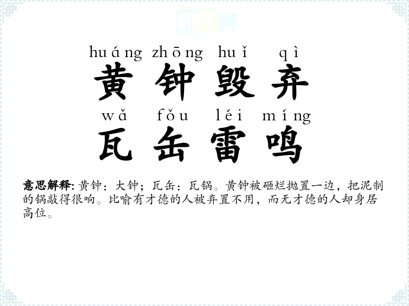 黄钟:大钟;瓦缶:瓦锅。黄钟被砸烂抛置一边,把泥制的锅敲得很响。比喻有才德的人被弃置不用,而无才德的人却身居高位。
