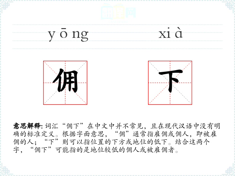 词汇“佣下”在中文中并不常见,且在现代汉语中没有明确的标准定义。根据字面意思,“佣”通常指雇佣或佣人,即被雇佣的人;“下”则可以指位置的下方或地位的低下。结合这两个字,“佣下”可能指的是地位较低的佣人或被雇佣者。