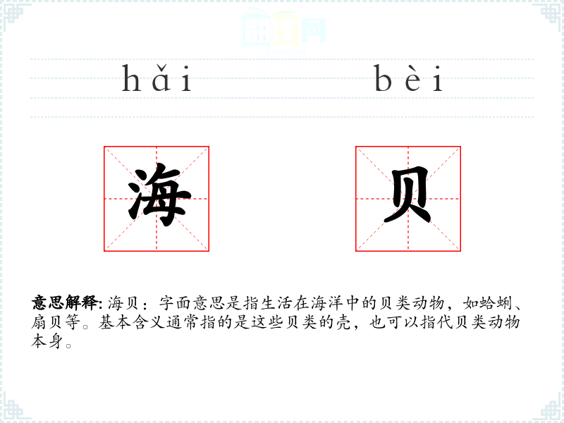 海贝:字面意思是指生活在海洋中的贝类动物,如蛤蜊、扇贝等。基本含义通常指的是这些贝类的壳,也可以指代贝类动物本身。