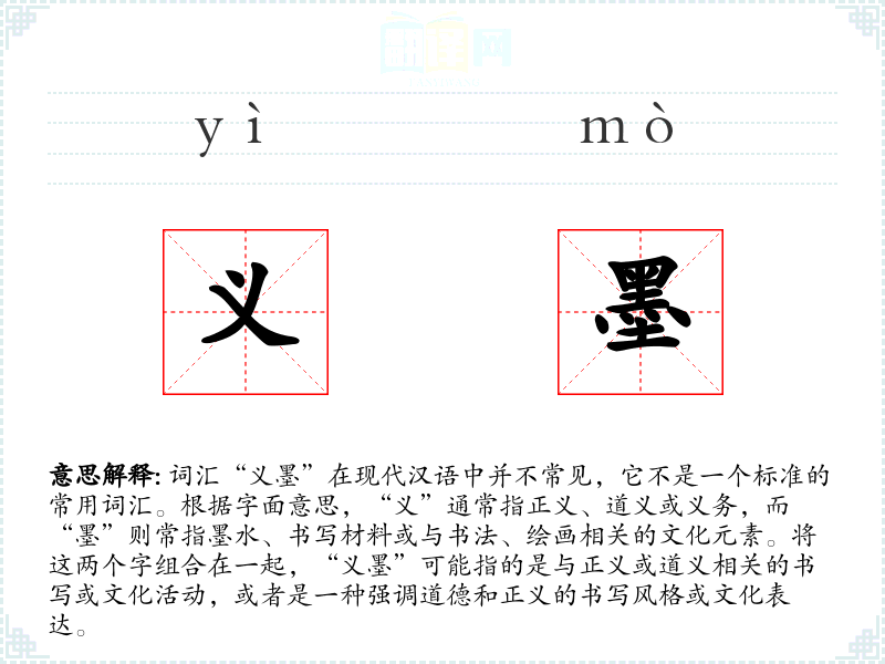 - 字面意思和基本含义:结合“义”和“墨”的含义,“义墨”可能指的是强调道德和正义的书写或文化活动。