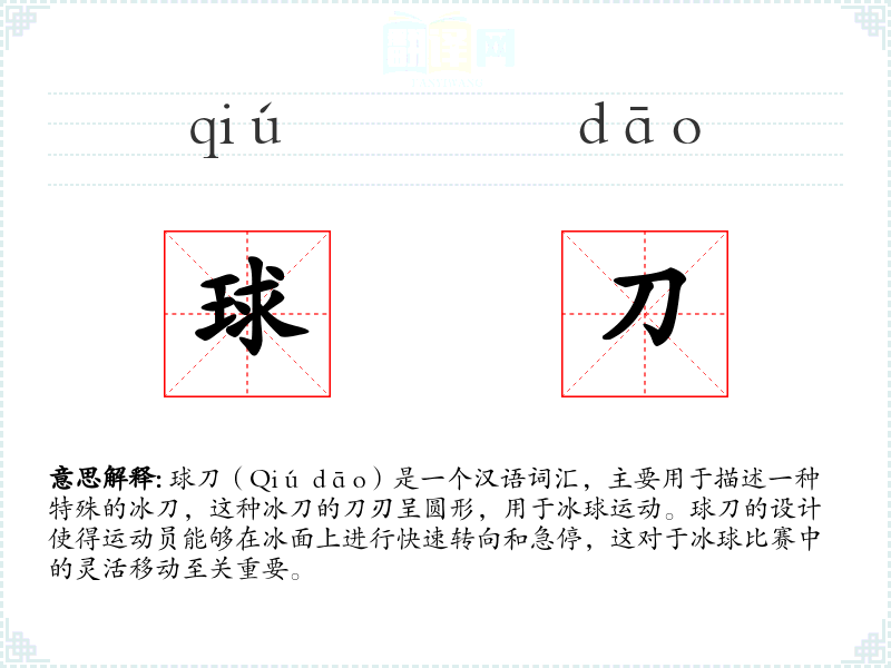 - 同义词:冰刀(Bīng dāo)- 广义上指用于冰上**的刀具,包括球刀。