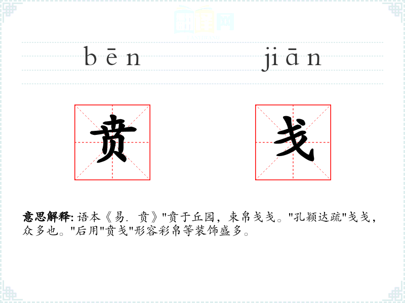 语本《易.贲》"贲于丘园,束帛戋戋。"孔颖达疏"戋戋,众多也。"后用"贲戋"形容彩帛等装饰盛多。