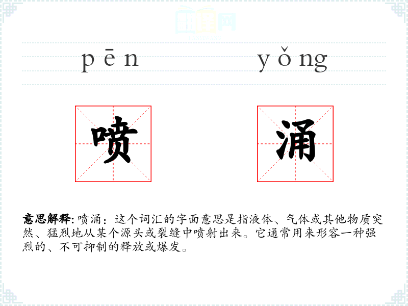 喷涌:这个词汇的字面意思是指液体、气体或其他物质突然、猛烈地从某个源头或裂缝中喷射出来。它通常用来形容一种强烈的、不可抑制的释放或爆发。